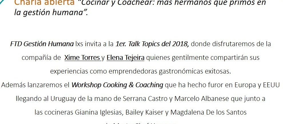 El pasado martes 19 de junio se llevó a cabo la 1er. Talk Topic del año de la Consultora FTD Gestión Humana en Youhub Cowork Carrasco, con la presencia de dos mujeres emprendedoras y muy destacadas de la cocina uruguaya; Xime Torres y Elena Tejeira y el apoyo de ADPUGH. Antes de ahondar en la actividad queremos agradecerles a ellas por confiar en este #proyecto y por otro lado a tod@s aquellas personas que nos acompañaron, esa tarde fría casi invernal. Entrando en tema, les contamos que el encuentro sirvió para mostrar cómo se desarrolla una sesión de #coaching #grupal donde la clave fundamental y el principal aliado del coach es la pregunta. Algunas de ellas que sirvieron de disparadoras para el diálogo fueron: ¿cocinar les ha servido como espacio de transformación personal y también profesional?, ¿de qué manera?, ¿han descubierto en algún momento alguna habilidad que no sabían que tenían en su background? Con sus respuestas pudimos descubrir a la persona que hay atrás de la emprendedora, sus fortalezas y debilidades, sus sueños y sentimientos, sus incertidumbres y certezas. Ahora bien ya que nuestro foco está en la #gestión #humana, aprovechamos la oportunidad para que nos contaran cuáles eran sus diferenciales para que sus #equipos sean no solo de alto rendimiento, sino que sirven para posicionar a su #marca #empleadora. Lo más importante que compartieron fue que invierten muchas horas de las jornadas diarias en saber cómo están sus colaboradores, en conocerlos a fondo, saber sobre sus vidas y ver que estén cómodos trabajado ya que, como es sabido las empresas gastronómicas tienen peculiares. Otro de los tips compartidos fue que no conciben otra forma de liderar sino es con el ejemplo, son grandes trabajadoras, como diríamos hoy en época del #mundial, mediocampistas completas, juegan de 3, pero también van al ataque, y ni que habar cuando hay que atajar algún penal, son las primeras en pararse sobre sus pies y mostrar que ser mujeres y además joven como expresó Xime, no han sido impedimentos para conseguir sus sueños.